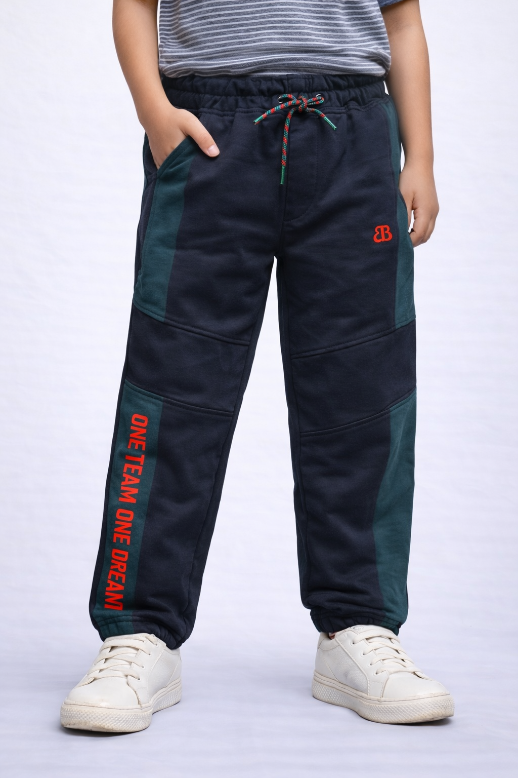 Featuring a modern color-block panel design with sporty typography detailing, these joggers bring a trendy look kids love. The elastic waistband with adjustable drawstring ensures a secure and comfortable fit, while side pockets add functionality.