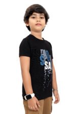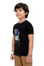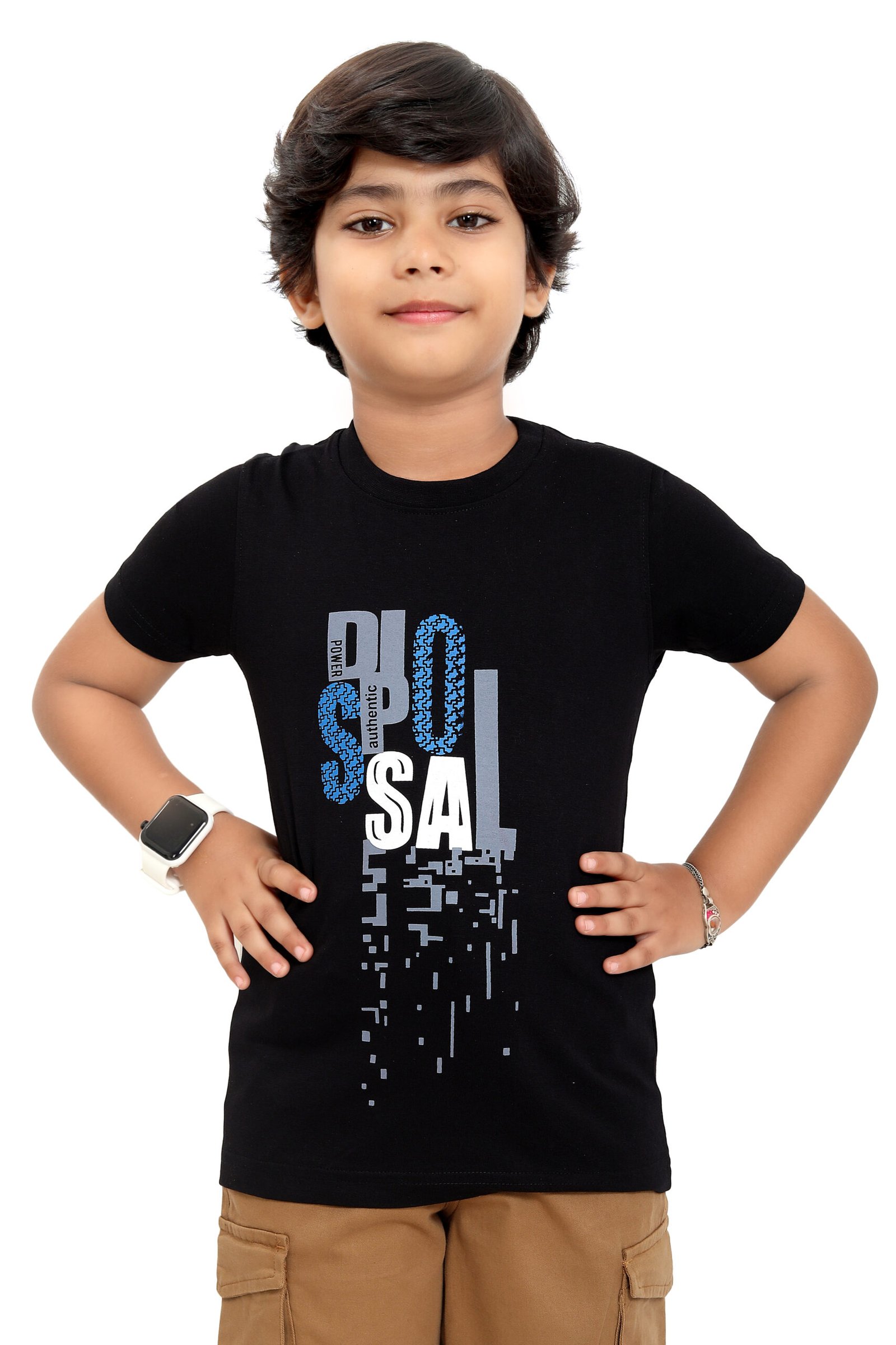 The classic black base combined with a dynamic pixel-style typography print in blue and white creates a bold and trendy look that kids love. Perfect for casual outings, school, or playtime, this T-shirt blends fashion with functionality.