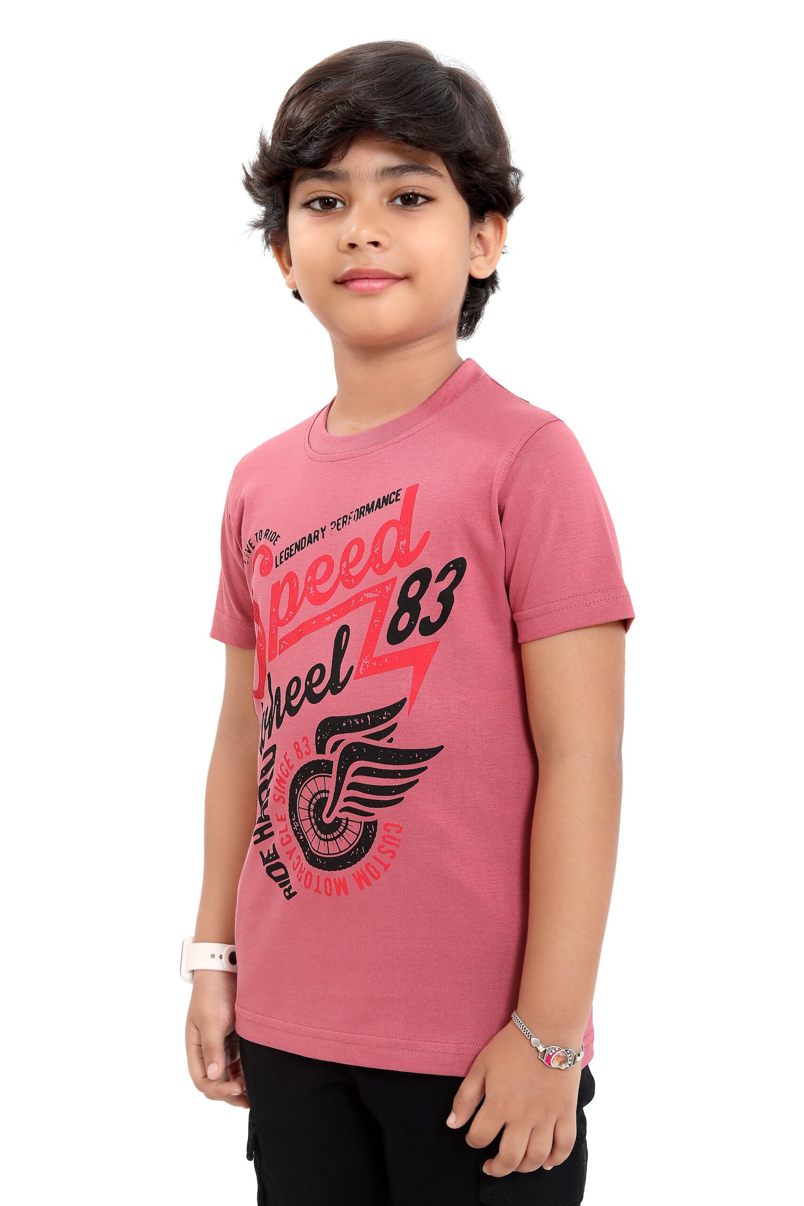 The eye-catching rose pink color combined with a bold “Speed Wheel 83” graphic print adds a dynamic and energetic vibe, perfect for kids who love action and adventure. Whether it’s playtime, outings, or casual wear, this T-shirt ensures both comfort and standout style.