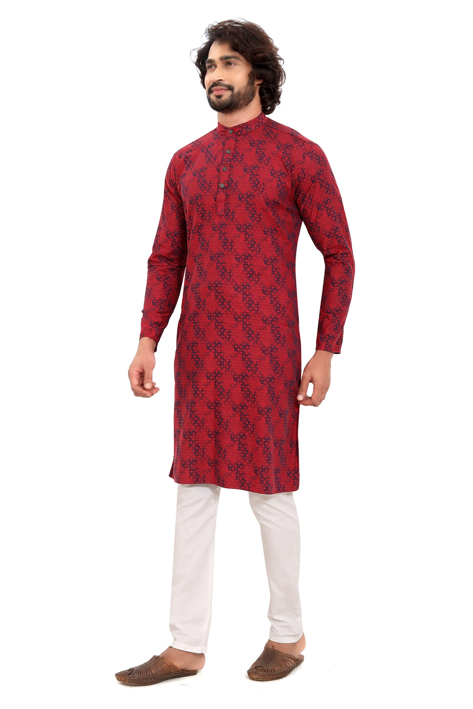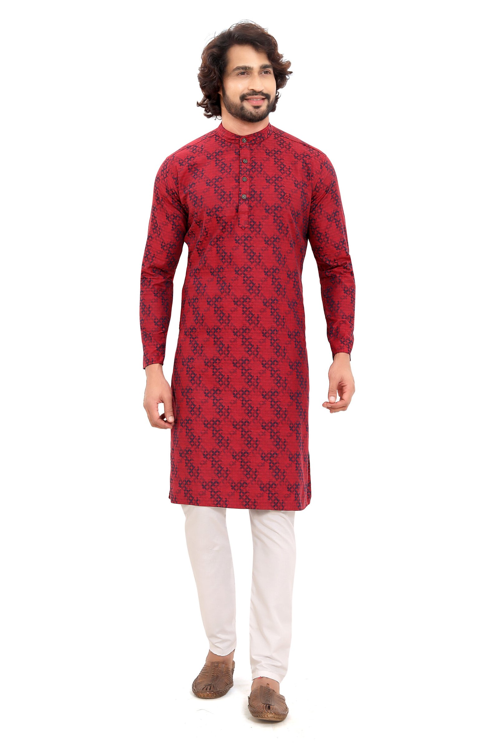 A statement red kurta crafted from 100% cotton jacquard fabric with a refined geometric weave. Designed for breathable comfort and sharp ethnic style—perfect for festive occasions and celebrations.