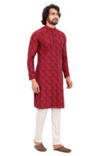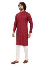 Designed with a mandarin collar and structured button placket, it delivers a clean, modern ethnic look. The vibrant red tone paired with subtle dark motifs enhances its premium appeal, making it suitable for weddings, festivals, and cultural gatherings.