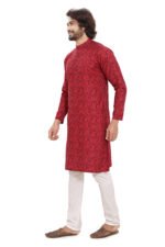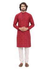 Upgrade your ethnic wardrobe with this premium red jacquard kurta crafted from 100% cotton. Designed for comfort and elegance, it features a subtle woven texture, modern fit, and breathable fabric—perfect for festive and special occasions.