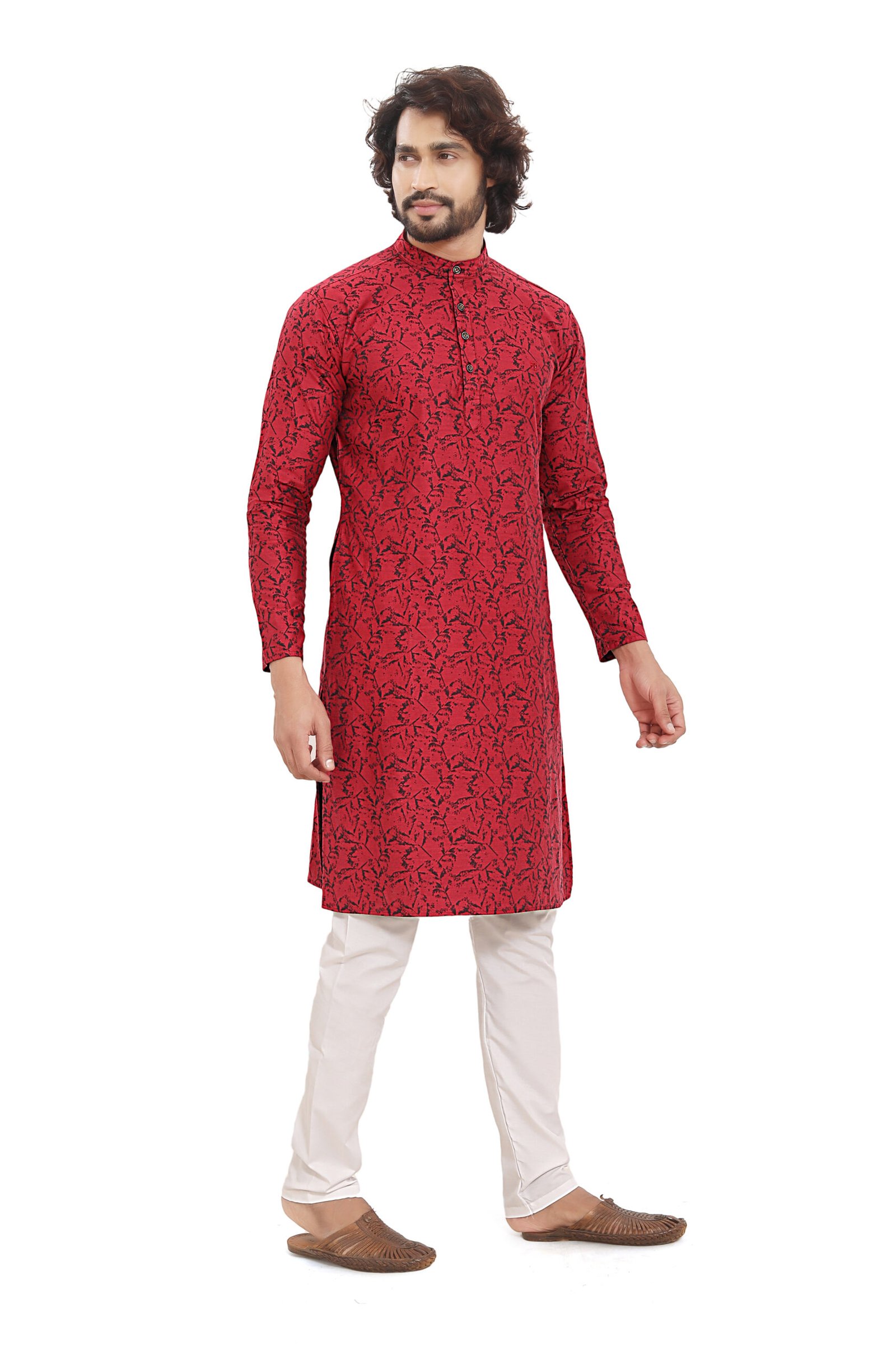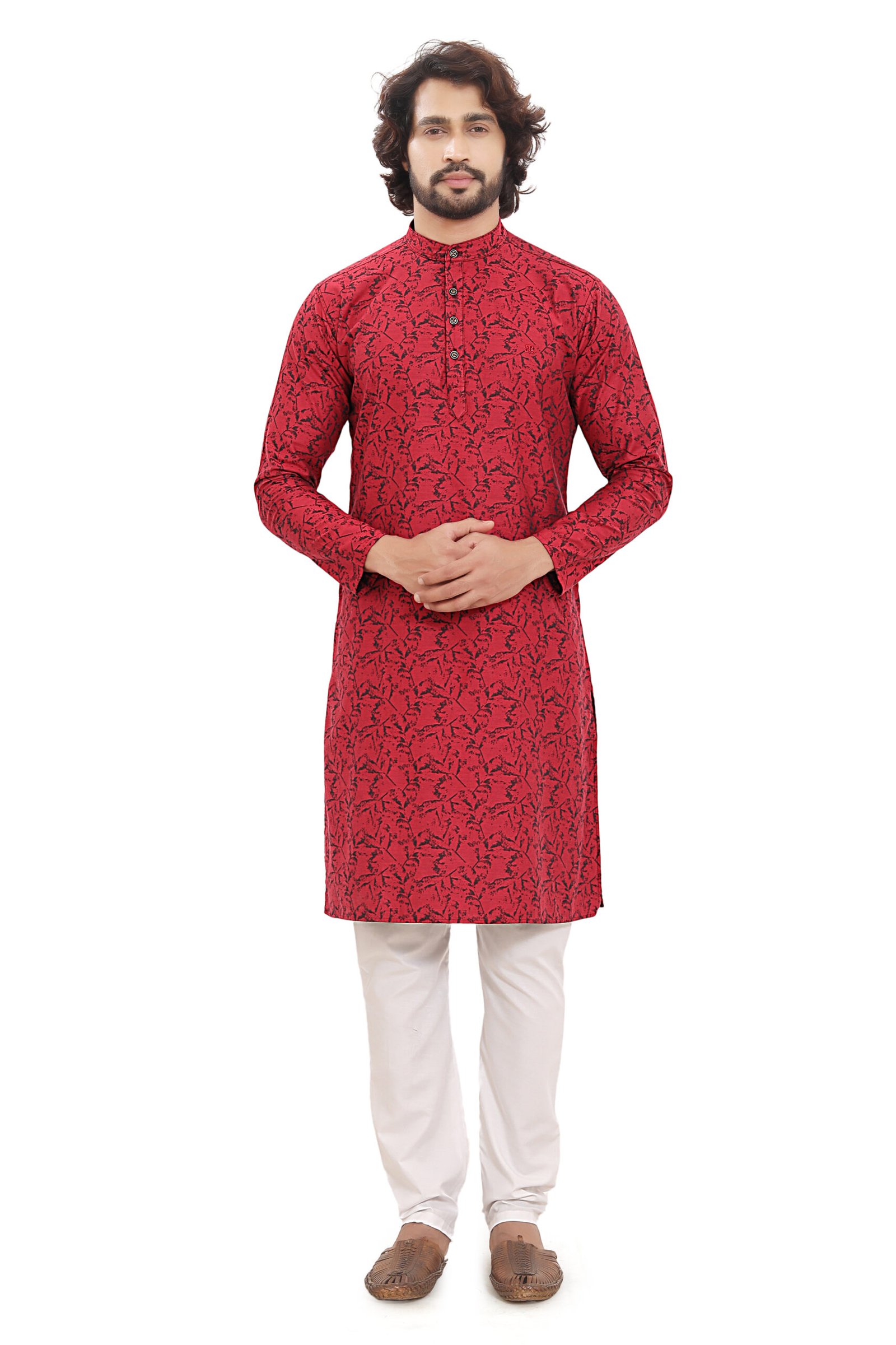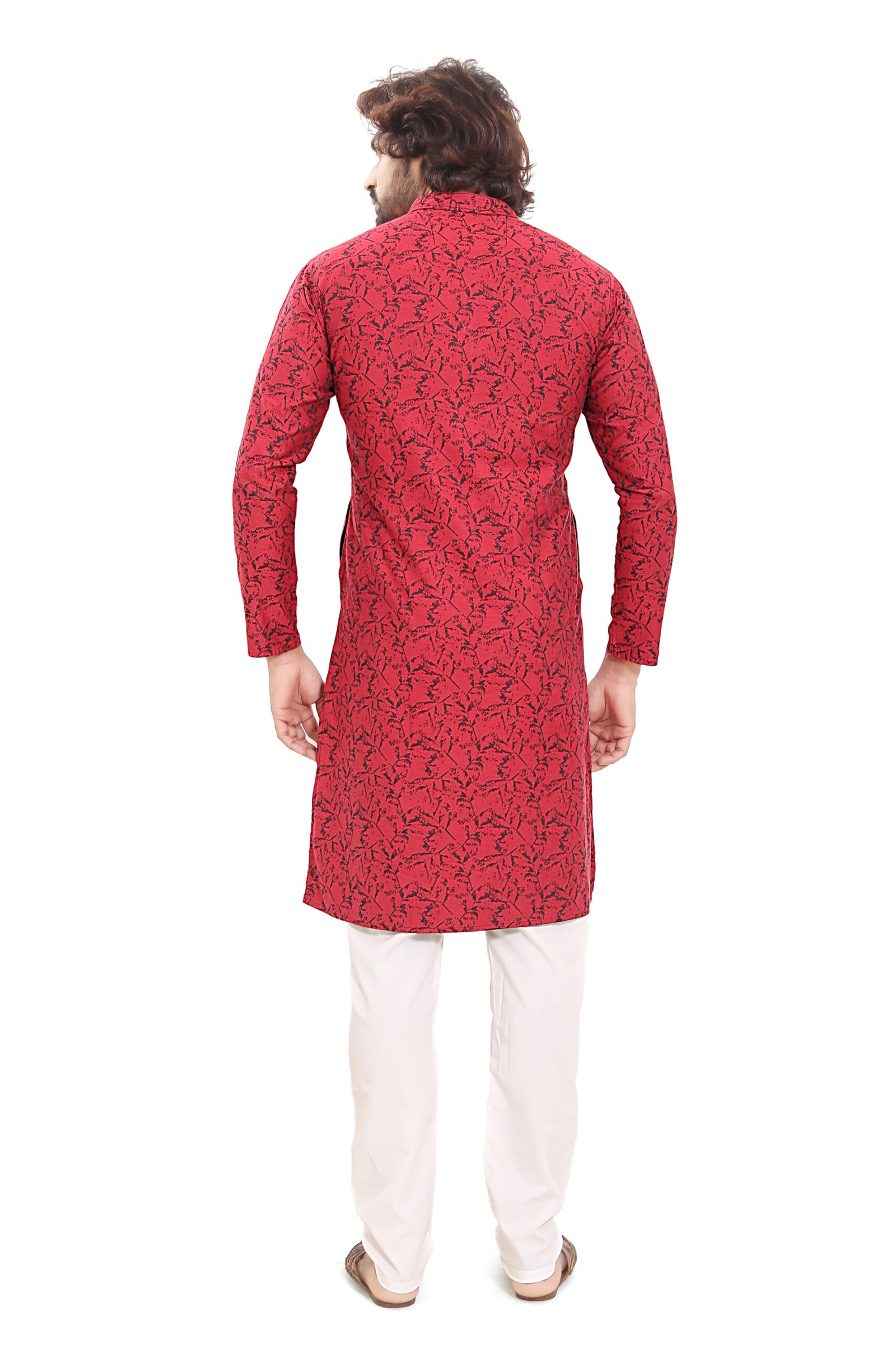 Crafted from 100% premium cotton jacquard fabric, this kurta offers a rich textured weave that elevates its overall appeal without compromising breathability. The vibrant red base with subtle woven patterns adds depth and sophistication, making it ideal for festive celebrations, weddings, and cultural events.