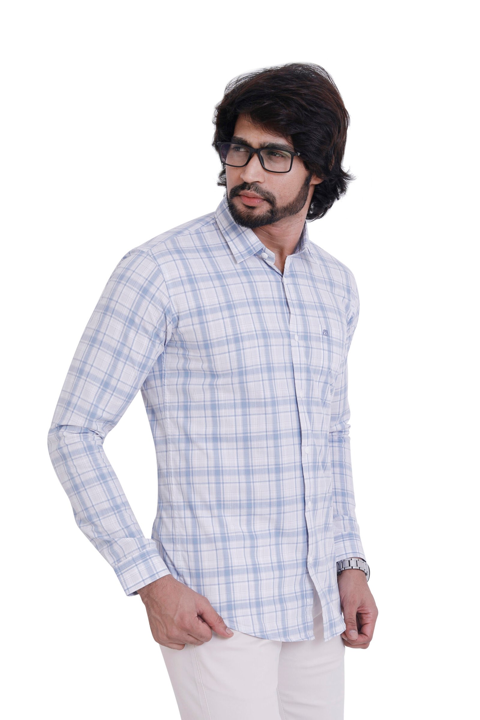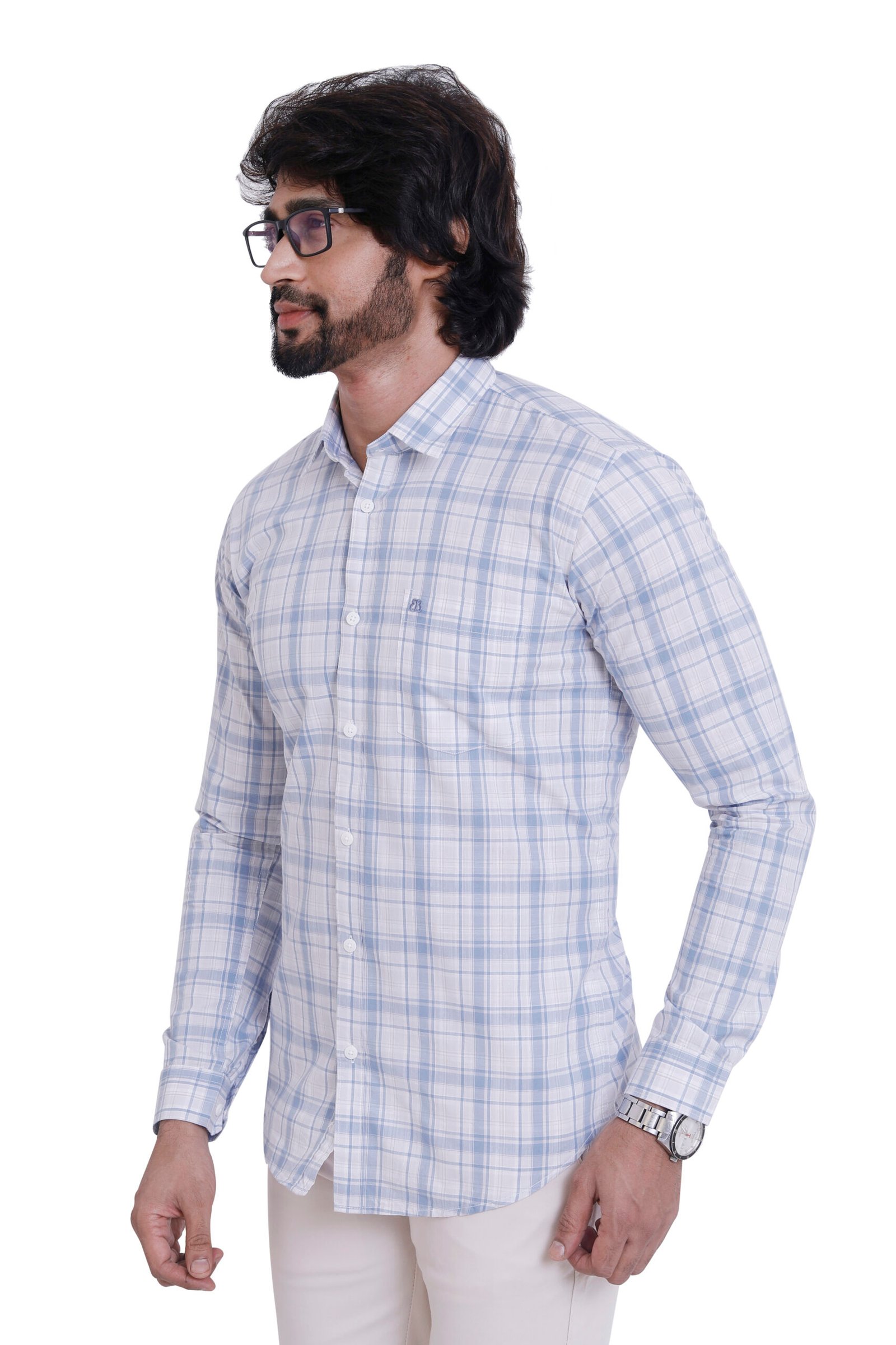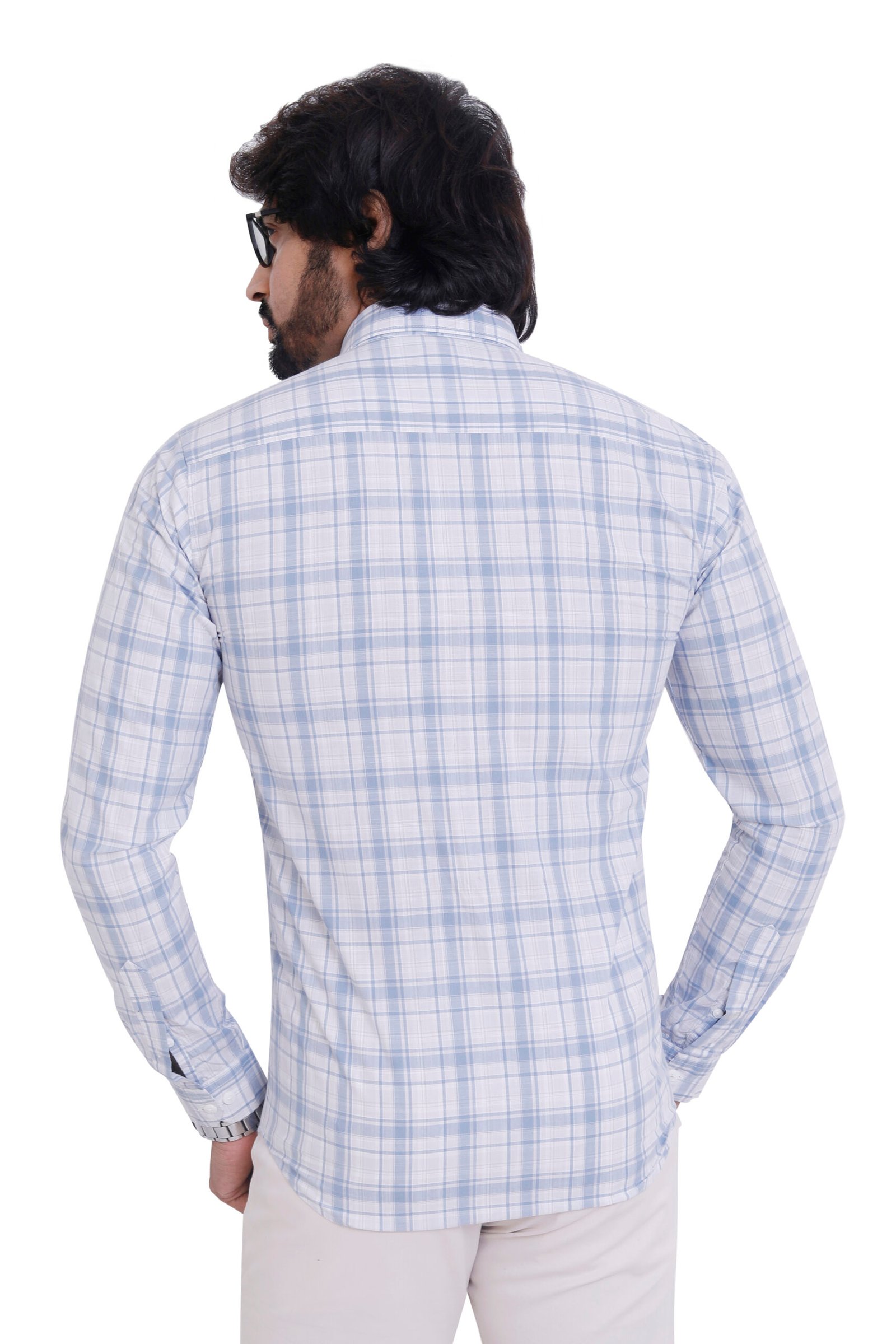 Fresh, light, and breathable—this 100% cotton sky blue check shirt delivers all-day comfort with a refined, modern look.